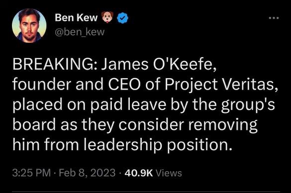 I need to make clear I have not resigned from the company, Project Veritas, I founded 13 years ago. I was stripped of my position as CEO and Chairman.