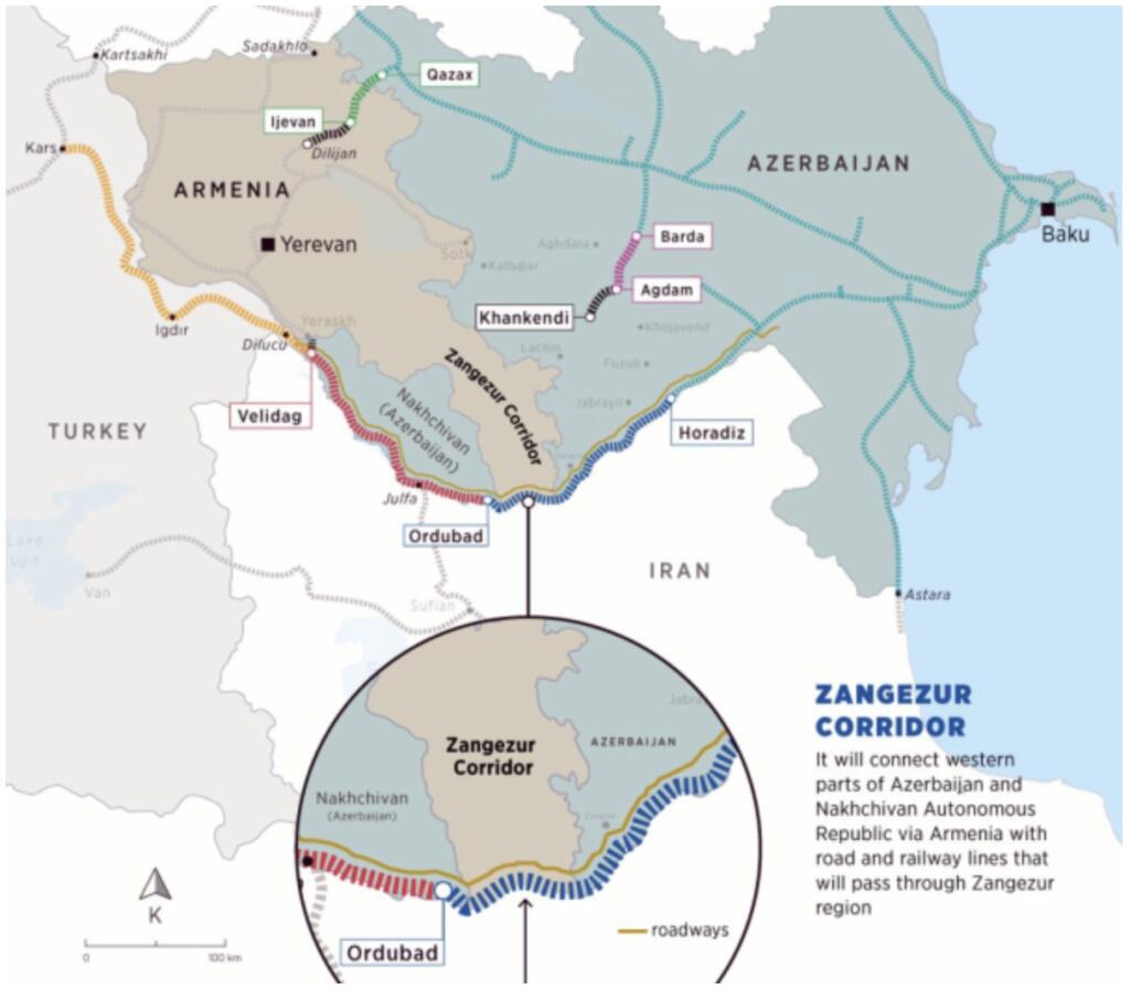 Much of the intrigue in the Caucasus centers around the so-called Zangezur Corridor, a 42-kilometer strip of land in southern Armenia wedged between Azerbaijan and its exclave, Nakhchivan, and bordered by Iran to the south.