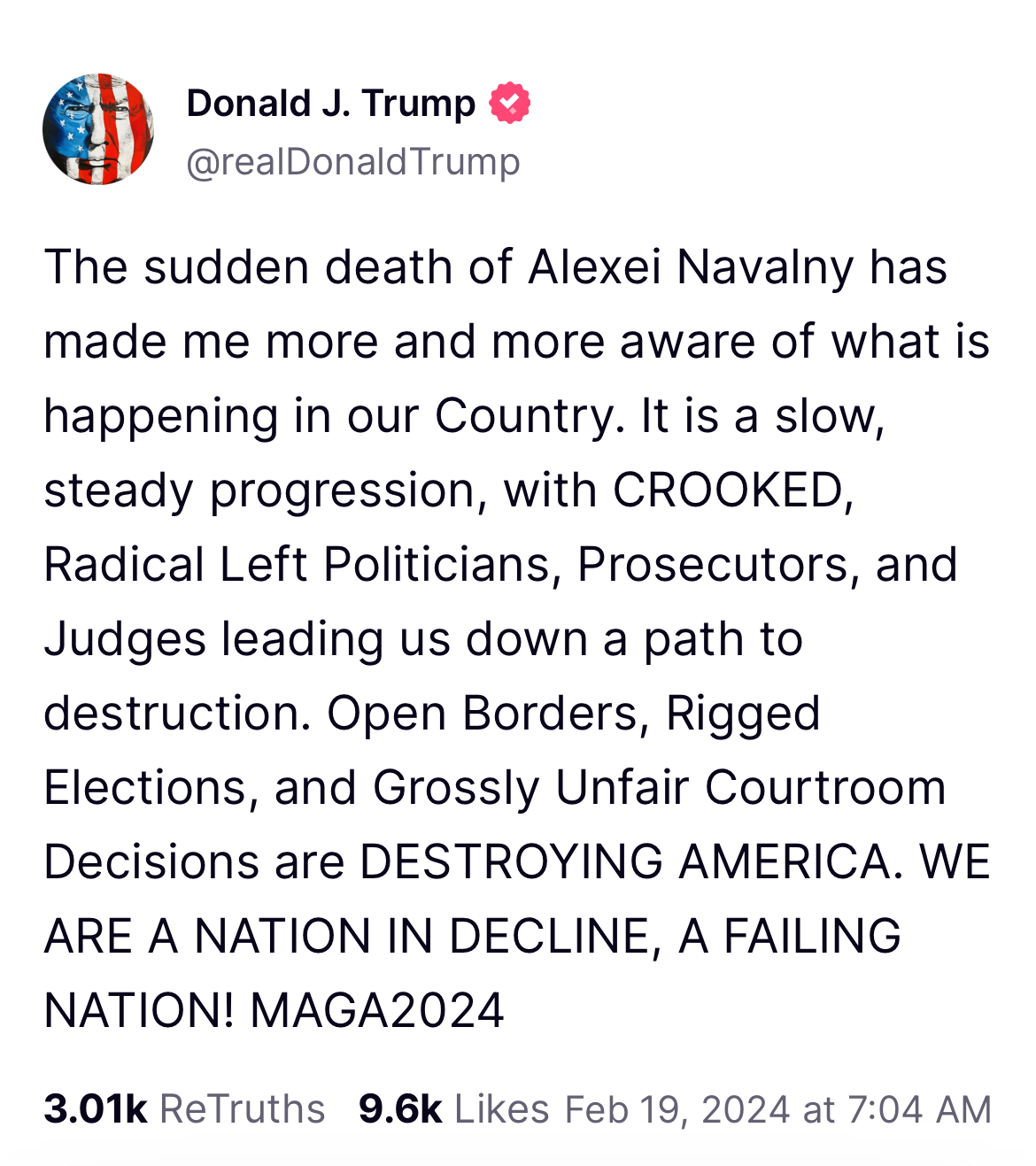 We can mourn and cast blame for the demise of Navalny...demonazis have no moral authority to do so.