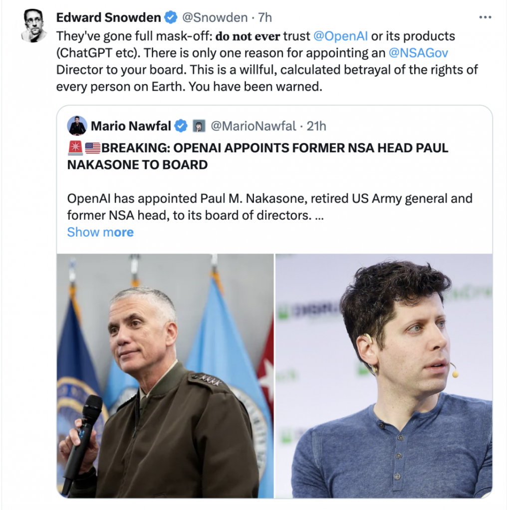 Topic: This is bad - Open AI hires former USA General & NSA head to its Board (Read 479 times)