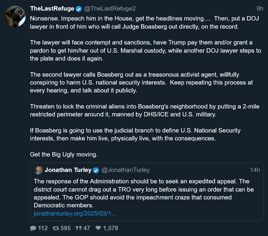 Rogue toxic-leftist judges like Boasberg et al are STILL trying to usurp Executive authority they didn't bat an eye at under the corrupt jello-headed DeepState Puppet Joe Biden when he flung the borders open and let in every criminal trash into our cities and communities to commit murders, rapes, beatings, robberies and spread lethal drugs in defiance of the immigration laws on our books!