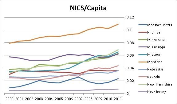 But who is buying these Guns? I Took the NICS Data per state and plotted the number of NICS checks per capita (assuming linear population growth from 2000 to 2010 and estimate numbers from the US Census for 2011)
